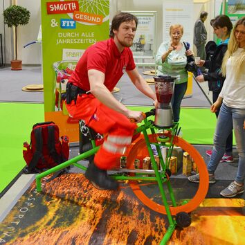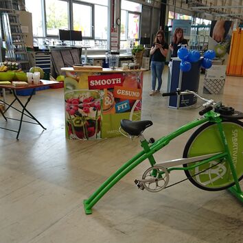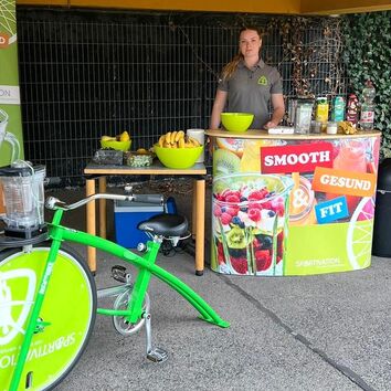 Wie lässt sich der Zusammenhang von Bewegung und Ernährung besser verdeutlichen, als auf einem Smoothiebike? Erleben Sie den Smoothiemixer, der durch eigene Muskelkraft betrieben wird, und nutzen Sie es für einen zwanglosen Einstieg in das Thema Ernährung und zur Sensibilisierung Ihrer Mitarbeiter.